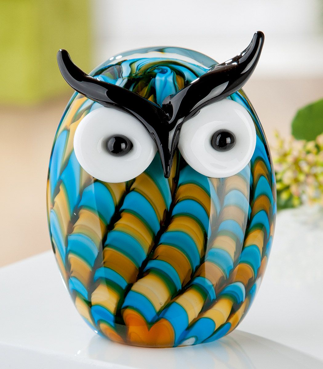 Ce hibou en verre multicolore est teinté dans la masse et soufflé à la bouche. Pour compléter une collection ou simplement apporter une petite touche de gaieté à votre décoration.