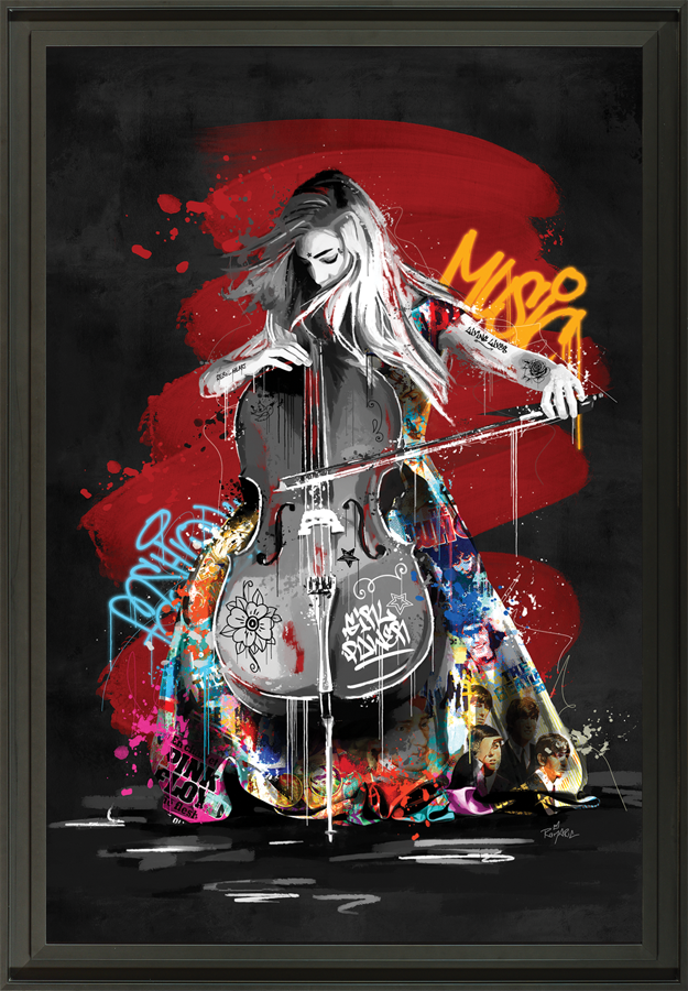 Image encadrée violoncelliste, Romaric artiste graphiste en street et pop art
