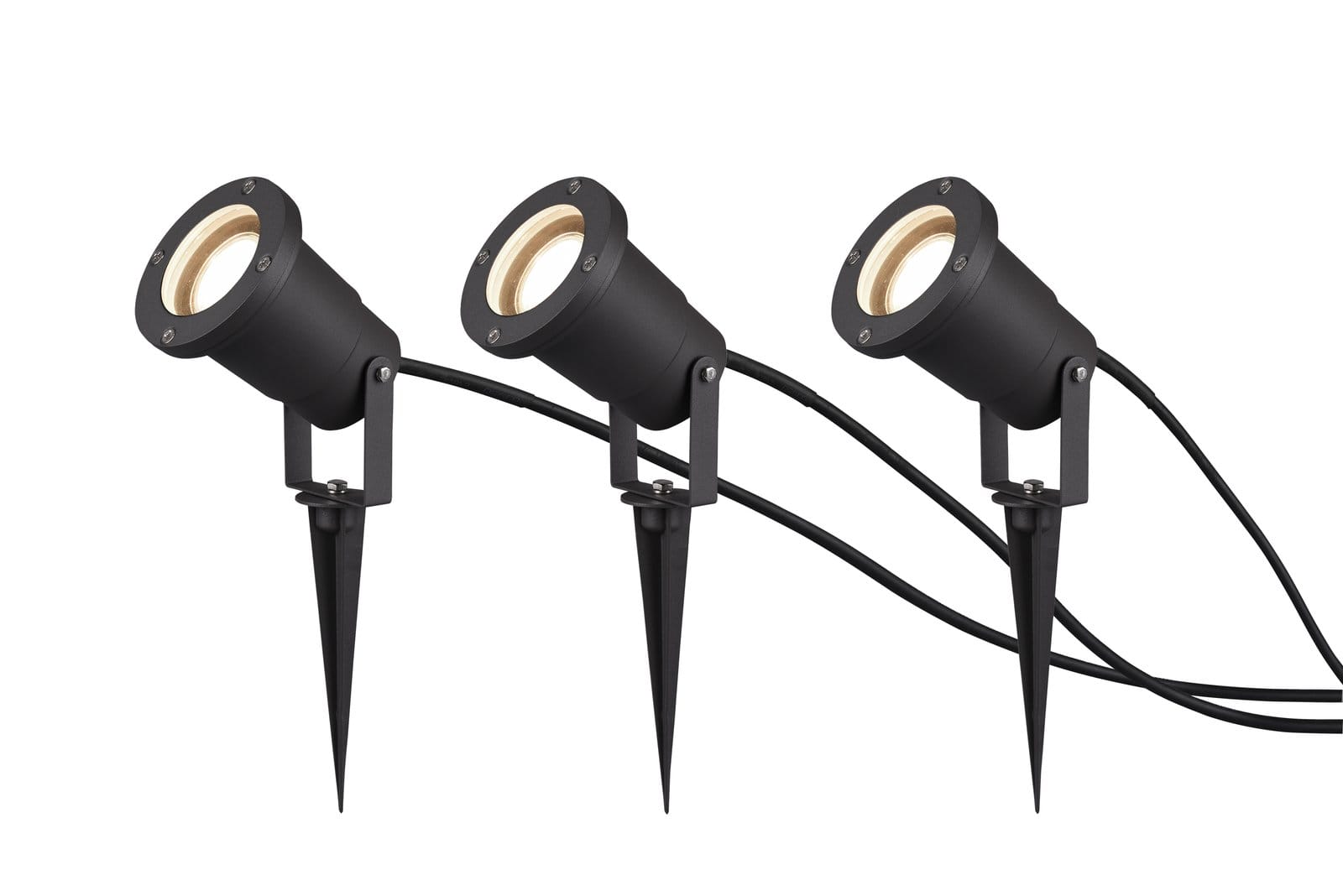 Kit de 3 spots extérieurs à piquer ou à fixer en aluminium anthracite, à équiper d’une ampoule projecteur GU10. Indice de protection IP65.