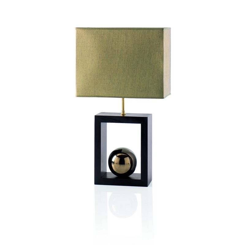 Lampe en bois noir et céramique doré émaillée avec un abat-jour rectangle en chintz mordoré.