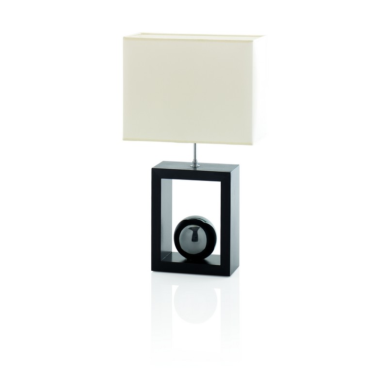 Lampe en bois noir et céramique anthracite émaillée avec un abat-jour rectangle en chintz blanc.
