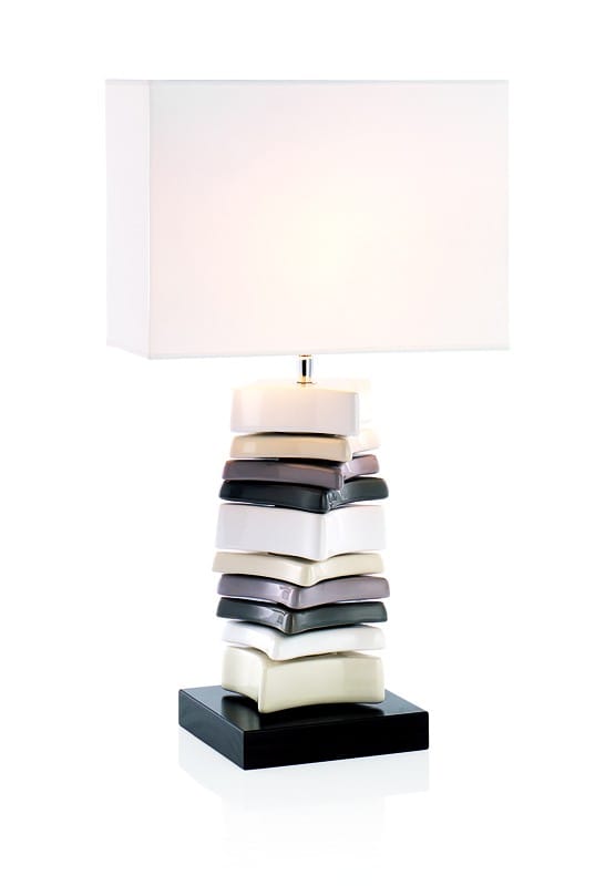 Lampe en céramique émaillée, tons gris et blanc, socle en bois noir, abat-jour rectangle en chintz blanc.