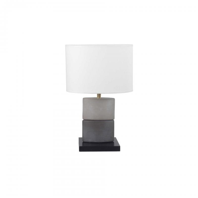 Lampe en céramique marron et ivoire, socle en bois wengue, abat-jour ovale en chintz blanc.