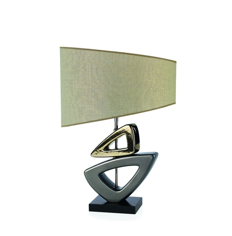 Lampe en céramique émaillée, tons métalliques et dorés, socle en bois noir, abat-jour ovale pointu.