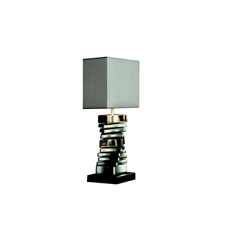 Lampe en céramique émaillée, tons métalliques et dorés, socle en bois noir, abat-jour rectangle en taffetas gris.
