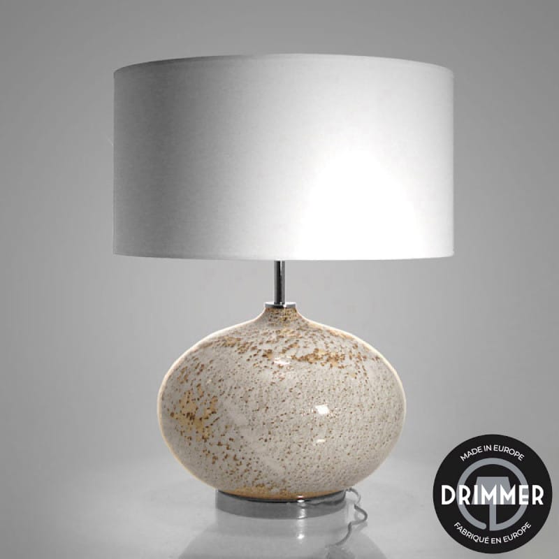 Lampe de table Volcanique, élégante avec une base crème en verre avec inclusions métalliques rappelant la roche volcanique. Son abat-jour cylindrique blanc diffuse une lumière douce et chaleureuse.