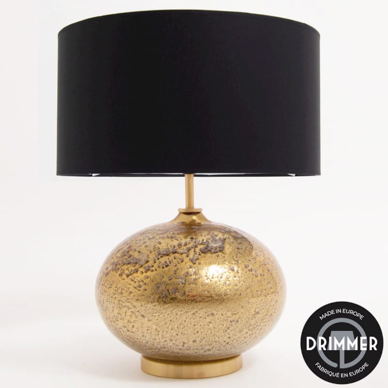 Lampe de table Volcanique, élégante avec une base dorée en verre avec inclusions métalliques rappelant la roche volcanique. Son abat-jour cylindrique noir diffuse une lumière indirecte.