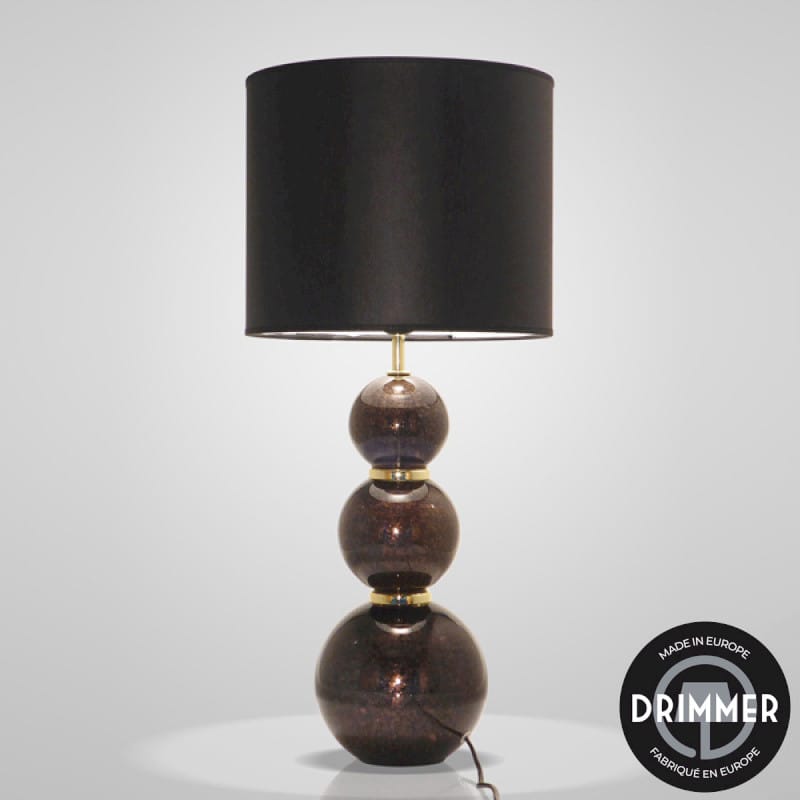 Lampe de table Volcanique, élégante avec une base composée de sphères noires en verre avec inclusions métalliques rappelant la roche volcanique. Son abat-jour cylindrique noir diffuse une lumière indirecte.