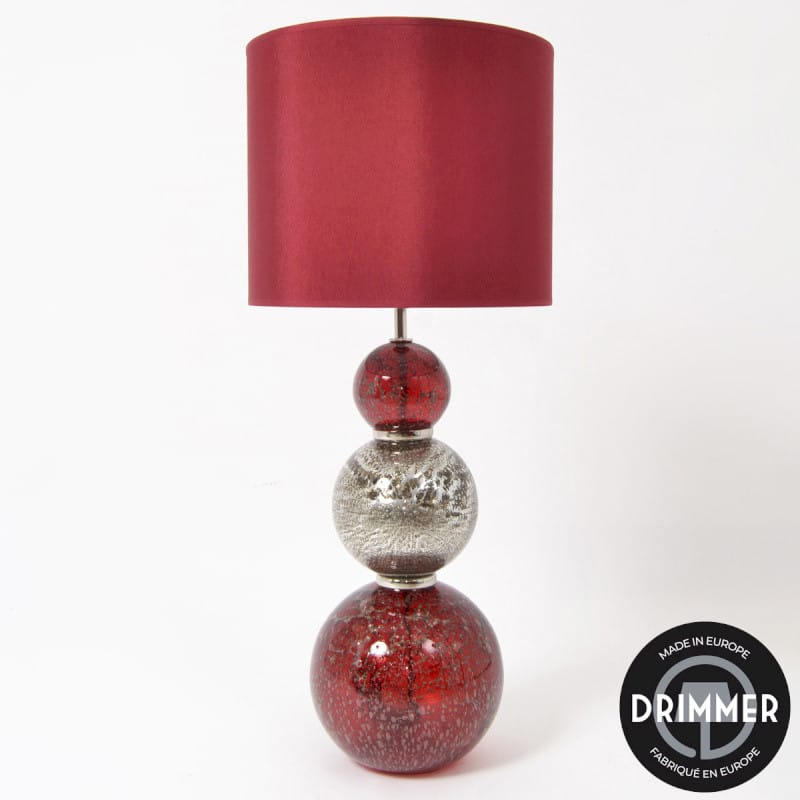 Lampe de table Volcanique, élégante avec une base composée de sphères rouges et argentées en verre avec inclusions métalliques rappelant la roche volcanique. Son abat-jour cylindrique rouge diffuse une lumière douce et chaleureuse.