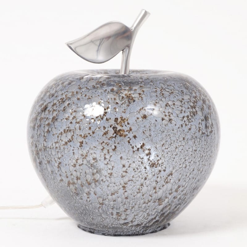 Lampe pomme Volcanique, originale en verre fumé avec inclusions métalliques et sa feuille en métal chromé. Elle ajoutera une touche de luxe et d’originalité à votre décor.