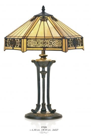 Cette lampe TIFFANY de style retro avec son abat-jour composé de pièces en pâte de verre montées à la manière des vitraux au décor art-déco, diffuse lumière douce et chaleureuse.