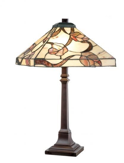 Cette lampe TIFFANY de style retro avec son abat-jour composé de pièces en pâte de verre montées à la manière des vitraux au décor végétal, diffuse lumière douce et chaleureuse.