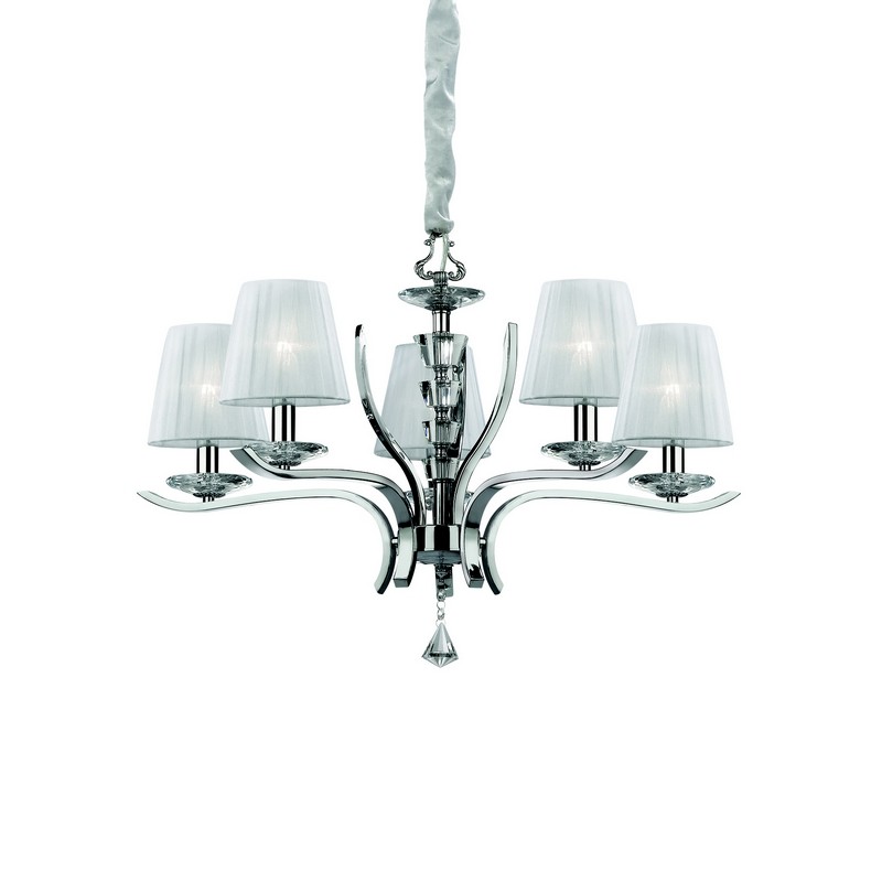 Lustre en métal chromé, corps et bobèches en cristal taillé transparent abat-jour organdi
