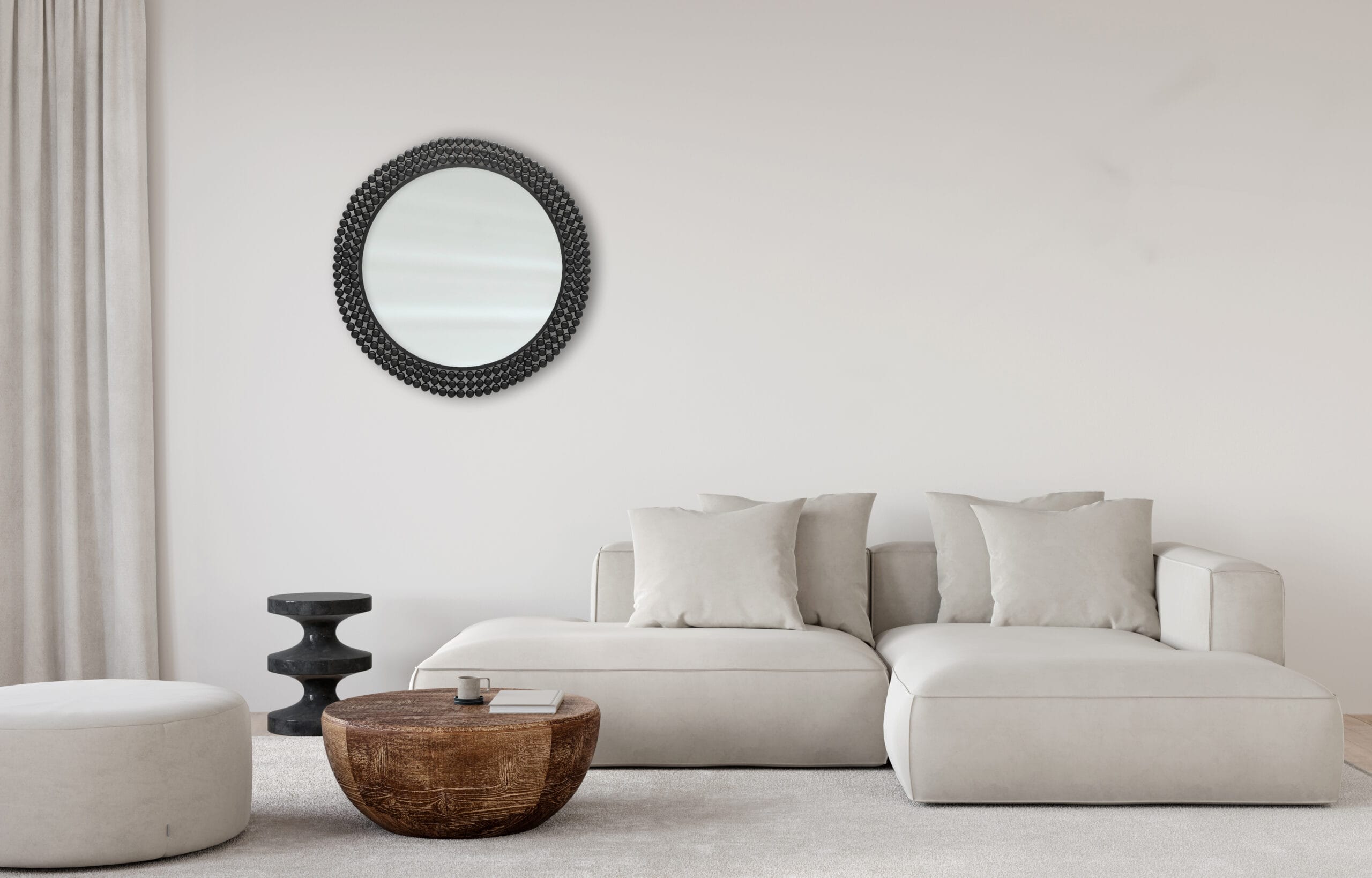 Miroir rond de diamètre 76 cm avec encadrement en métal composé de boules noires. Parfait pour égayer un séjour ou une entrée.