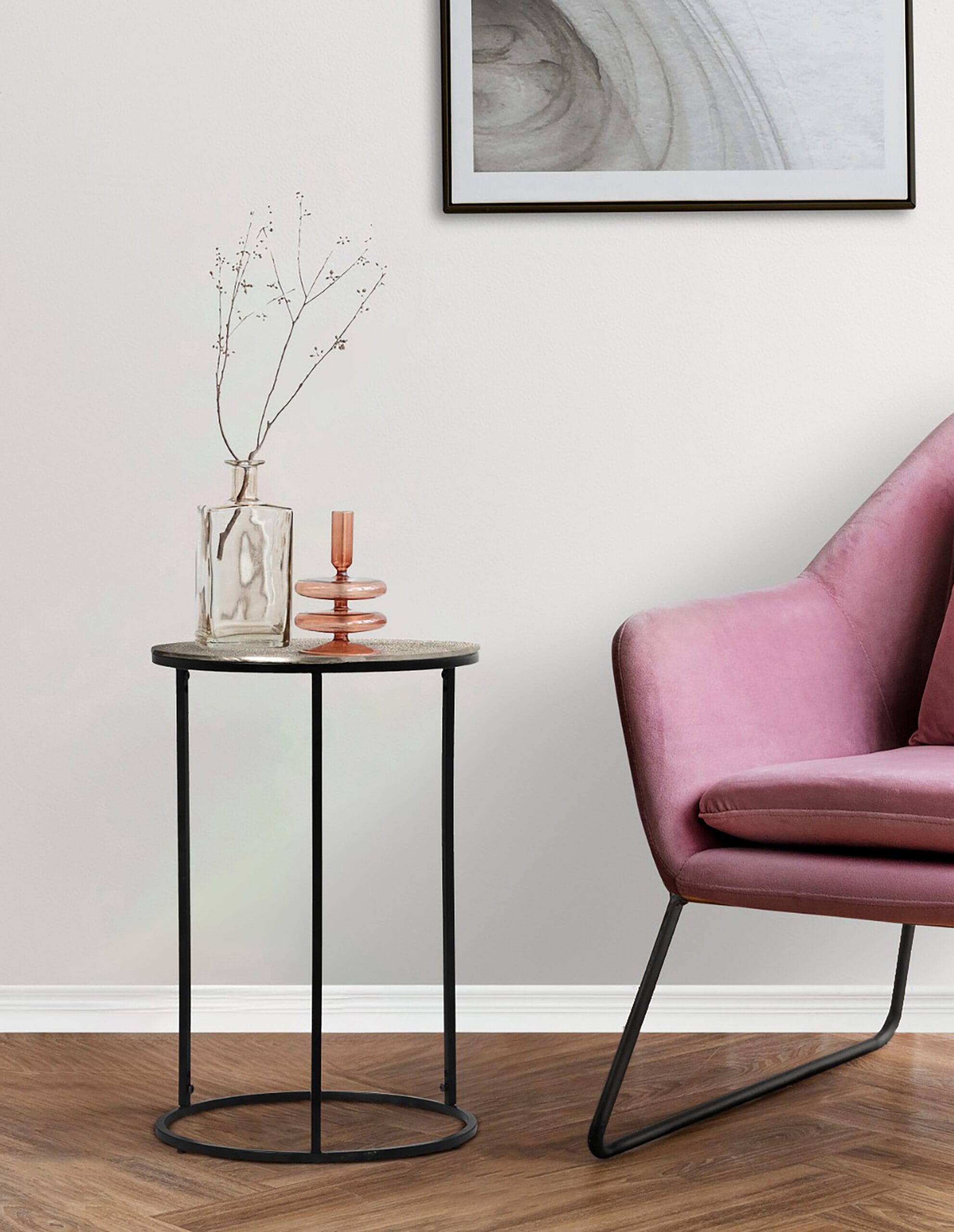 Sellette en métal noir plateau en aluminium argenté 41×61 cm. Mettra en valeur une belle lampe ou même une plante d’intérieur.