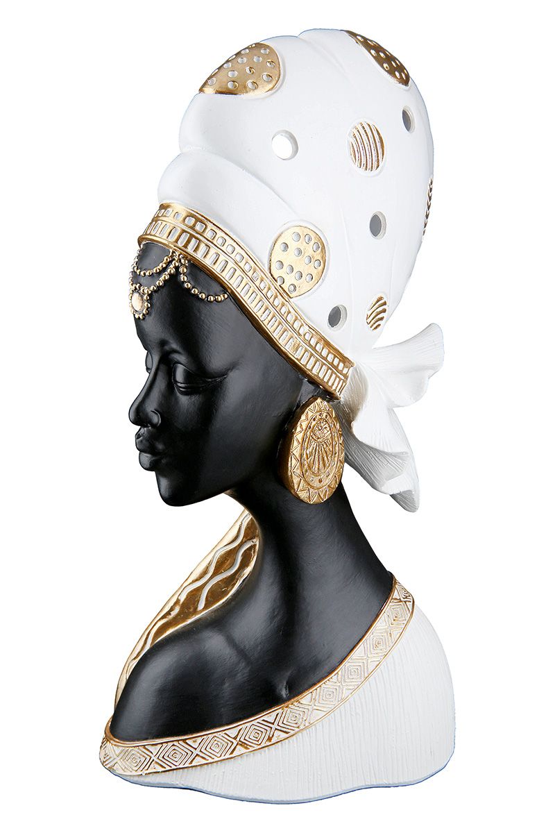 Faites entrer le soleil dans votre maison avec cette jolie statue de femme africaine en résine crème, noire et dorée.