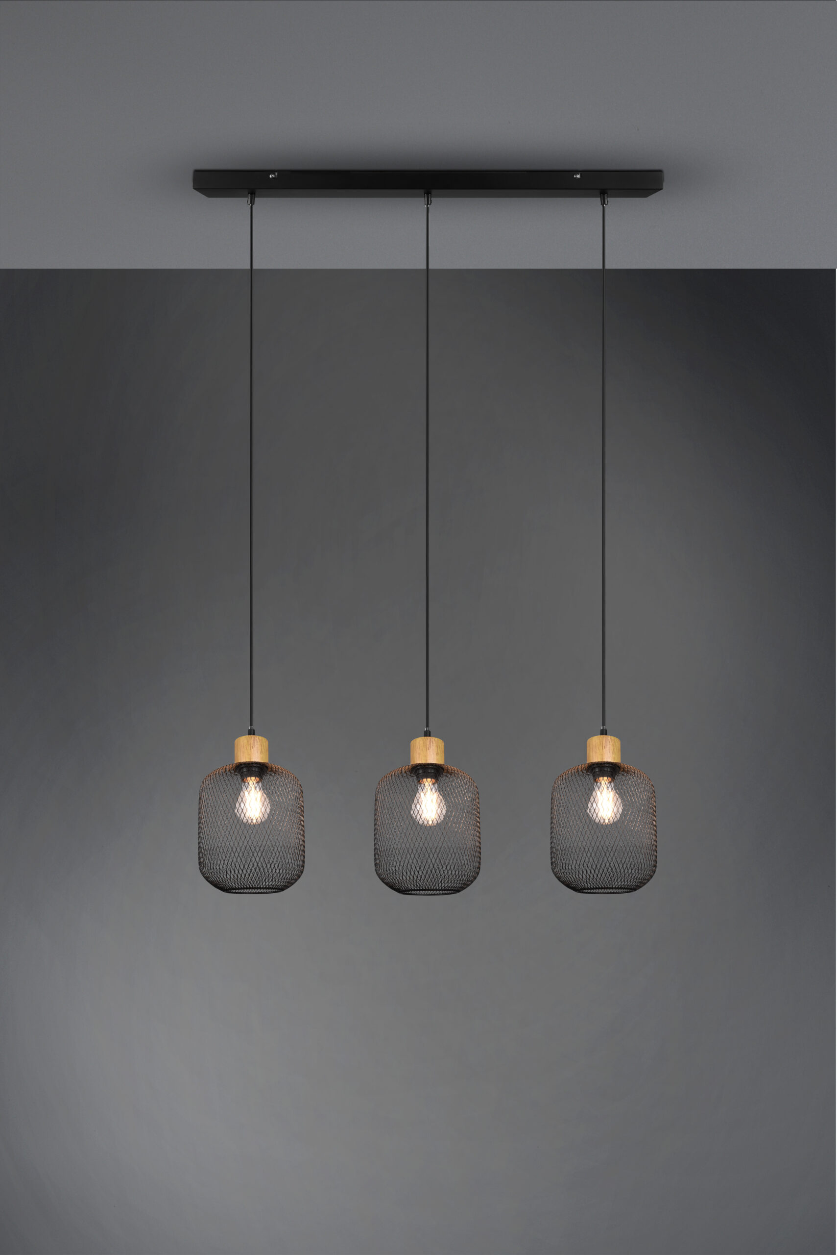 Cette suspension triple combine l’esthétique industrielle du grillage métallique avec la chaleur du bois. Il offre un éclairage design et harmonieux, parfait pour illuminer une table ou un îlot central.