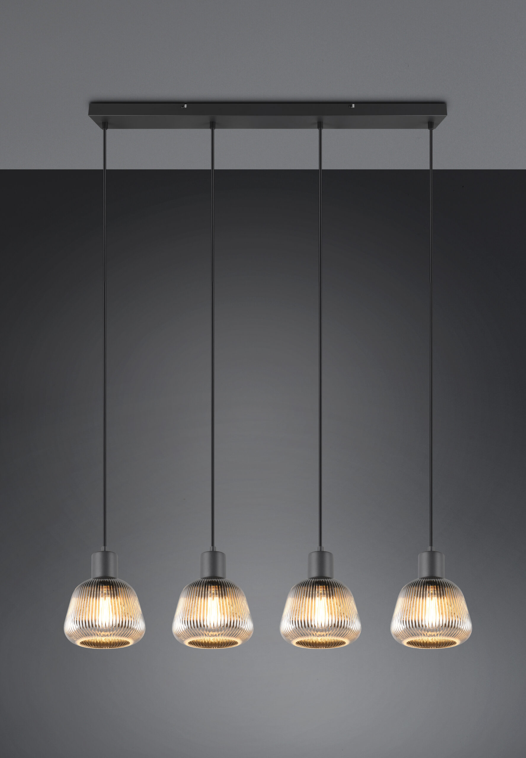 Cette suspension en métal noir avec ses quatre verres cannelés fumés apporte une touche vintage et sophistiquée. Il est parfait pour éclairer avec style une table de salle à manger ou un îlot de cuisine, diffusant une lumière douce et texturée.