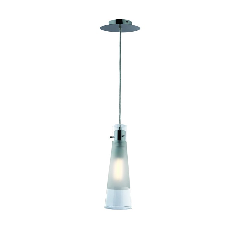 Suspension KUKY SP1, sobre et élégante en métal chromé et verrerie satiné à bord clair, procurant une lumière franche. Au dessus d’un bar par exemple