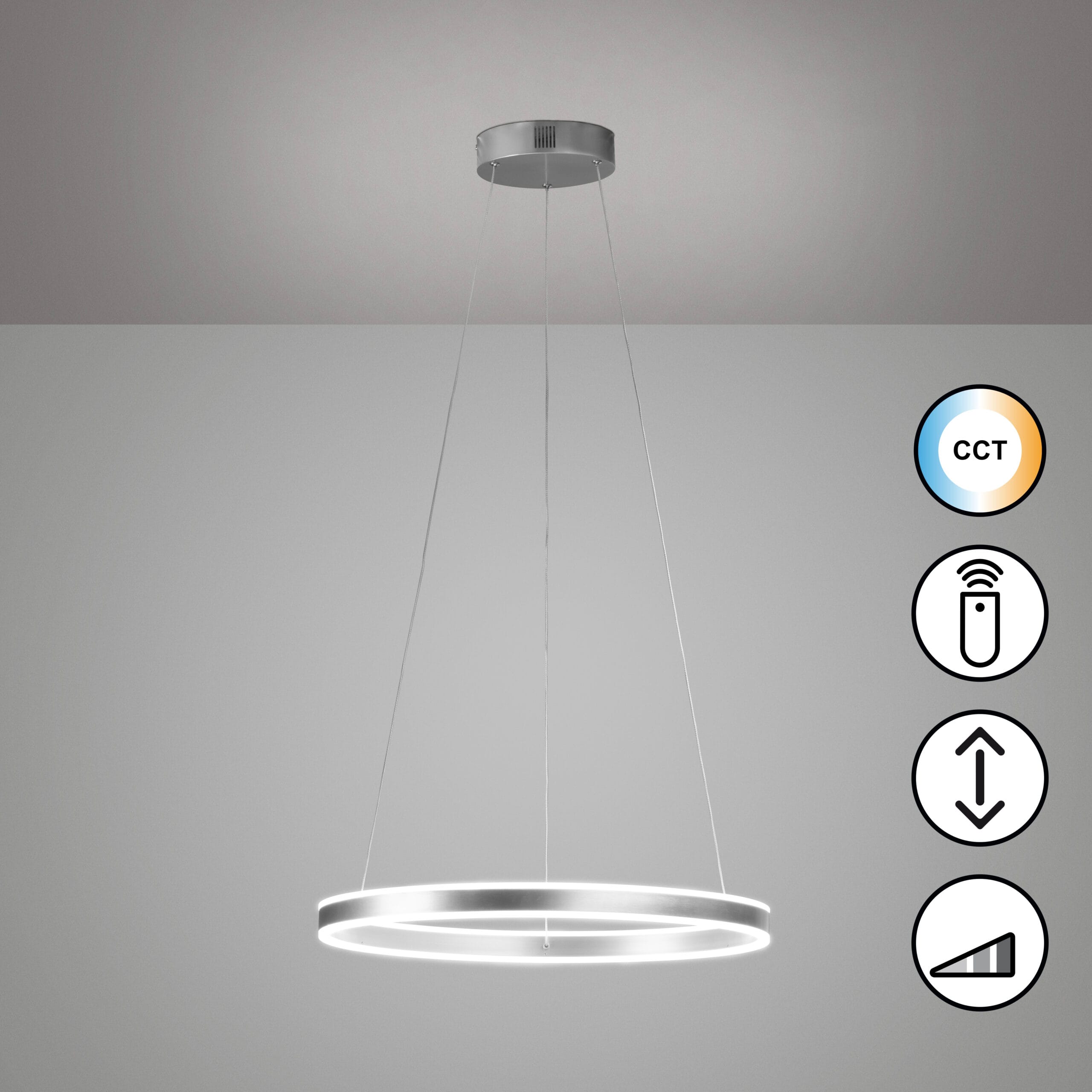 Suspension LED en métal décor nickel au design minimaliste, elle s’intègrera parfaitement à tous les intérieurs. Sa LED puissante vous offrira un éclairage efficace et agréable. Avec sa télécommande vous pourrez régler l’intensité et la couleur de la lumière du blanc chaud au blanc froid.