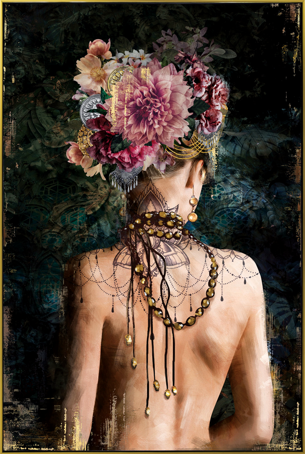Toile femme coiffe florale et bijoux encadrement caisse américaine noire bord doré