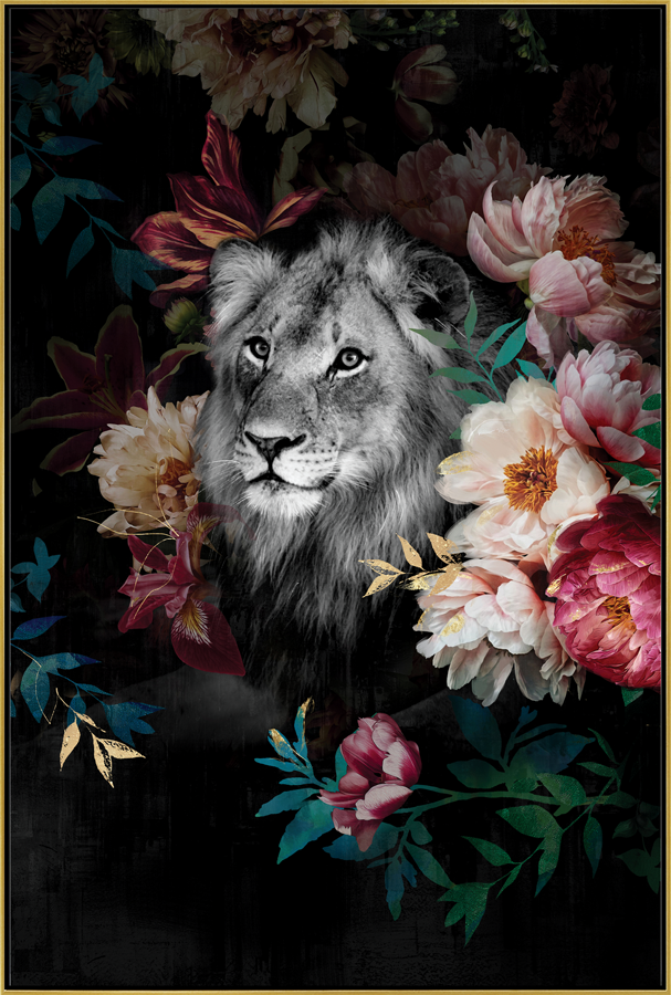 Toile fleurie tête de lion encadrement caisse américaine noire bord doré