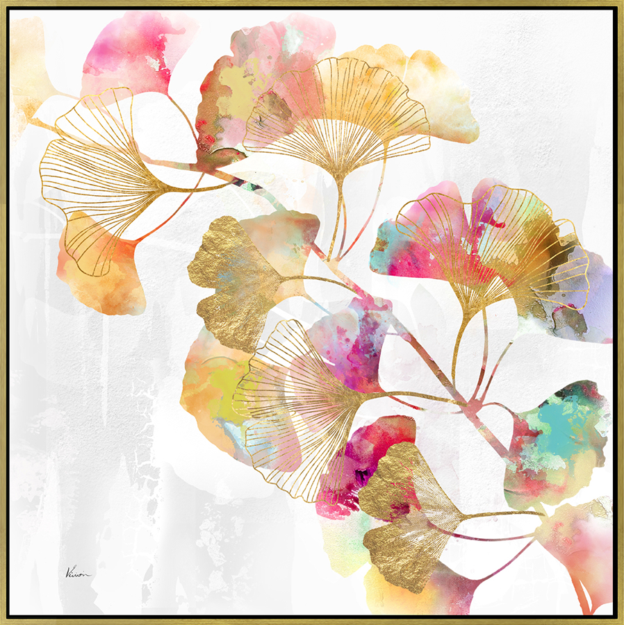 Toile ginkgo polychromes caisse américaine noire bord doré