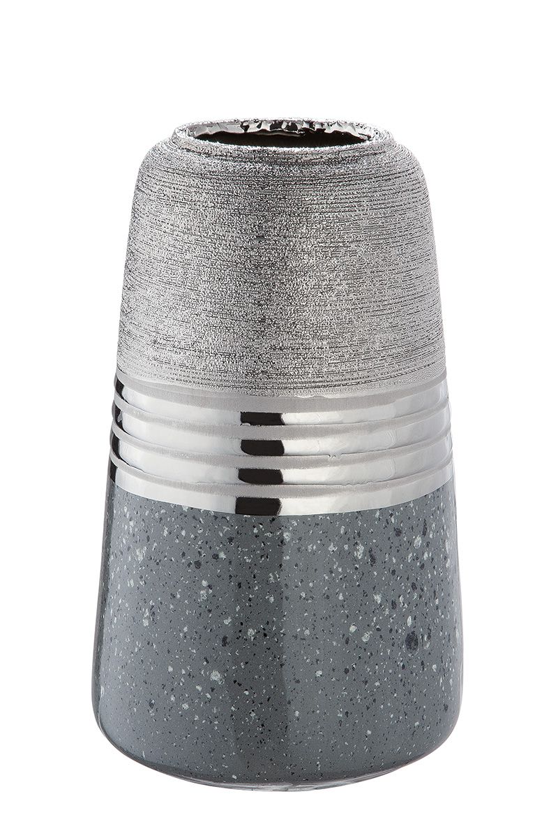 Vase céramique au décor gris moucheté, argent strié et réhaussé d’émail chrome, pour accueillir un joli bouquet de fleurs ou en simple objet de décoration.