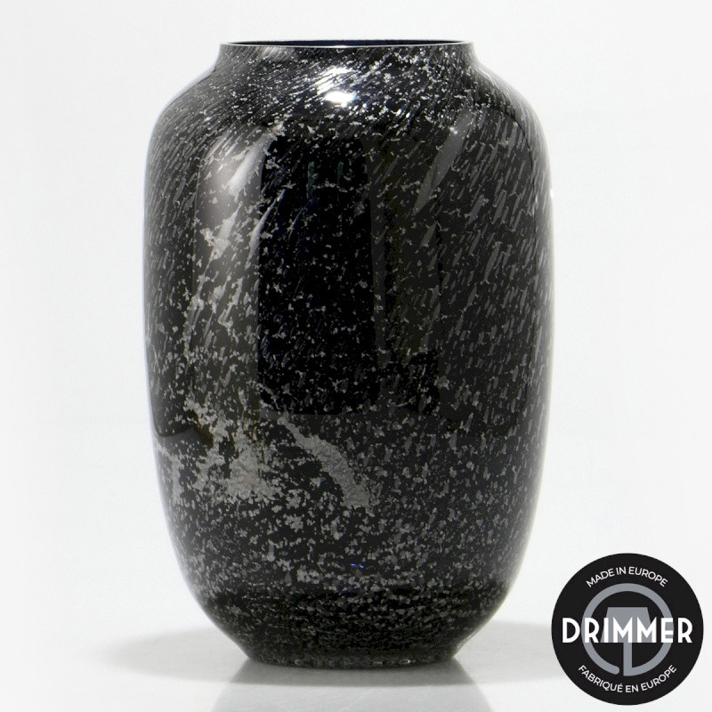 Vase en verre noir avec inclusions métalliques. Sa forme épurée et contemporaine en fait un objet décoratif élégant.