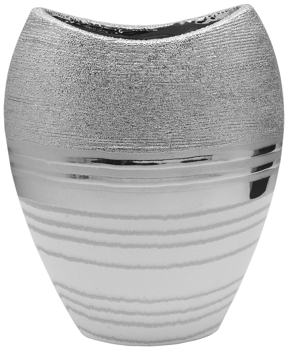 Ce vase ovale en céramique au décor blanc rayé, argent strié et réhaussé d’émail chrome, sublimera vos compositions florales ou simplement, votre intérieur.